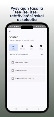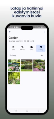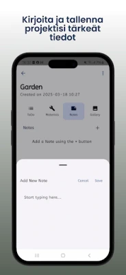 Älä anna yhdenkään inspiraation tai tärkeän yksityiskohdan lipua ohitsesi. DIYProjectPlanner toimii keskitettynä paikkana kaikille muistiinpanoillesi, luonnoksillesi, ohjeillesi ja ideillesi, pitäen ne siististi tallessa kunkin projektin yhteydessä. Dokumentoi edistymistäsi ja kokoa inspiraatiota monipuoliseen valokuvagalleriaan, jossa voit tallentaa vaihekuvat, esitellä valmiit luomuksesi tai koota visuaalisen ideapankin tulevia projekteja varten. DIYProjectPlanner on kattava kumppani, joka varmistaa, että tee-se-itse-matkasi on järjestelmällinen, tehokas ja nautinnollinen alusta loppuun.